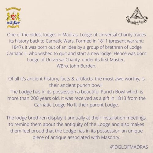 Of all it’s ancient history, facts & artifacts, the most awe-worthy, is their ancient punch bowl! The Lodge has in its possession a beautiful Punch Bowl which is more than 200 years old. It was received as a gift in 1813 from the Carnatic Lodge No II, their parent Lodge.⠀